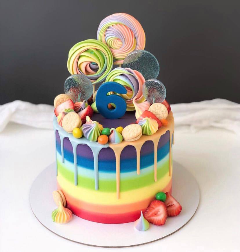 Торт украшен яркой и красочной «сказочной радугой», которая создаёт праздничное настроение и привлекает внимание всех гостей.