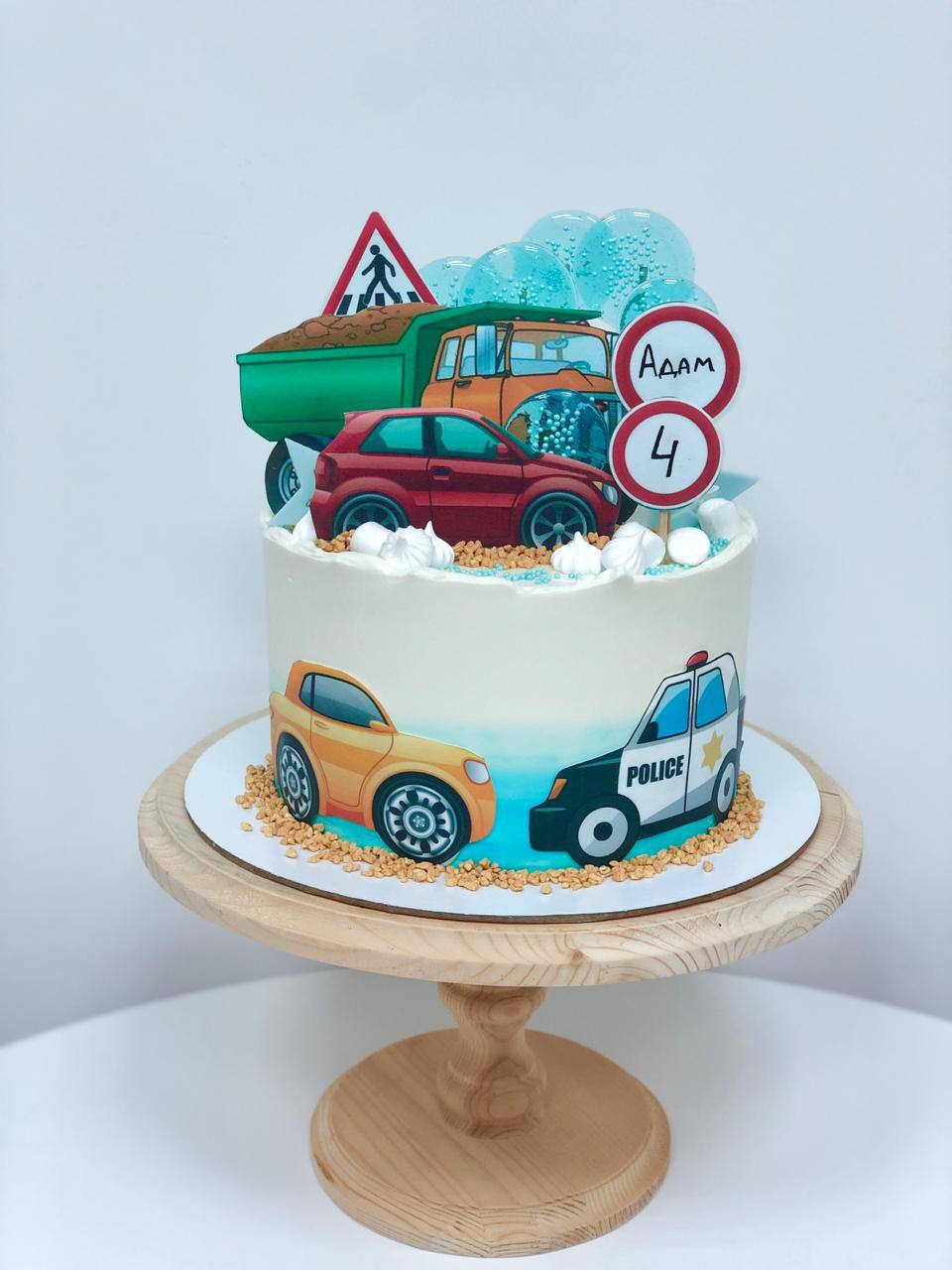 Десерт декорирован изображениями автомобилей, что делает его оригинальным и запоминающимся.