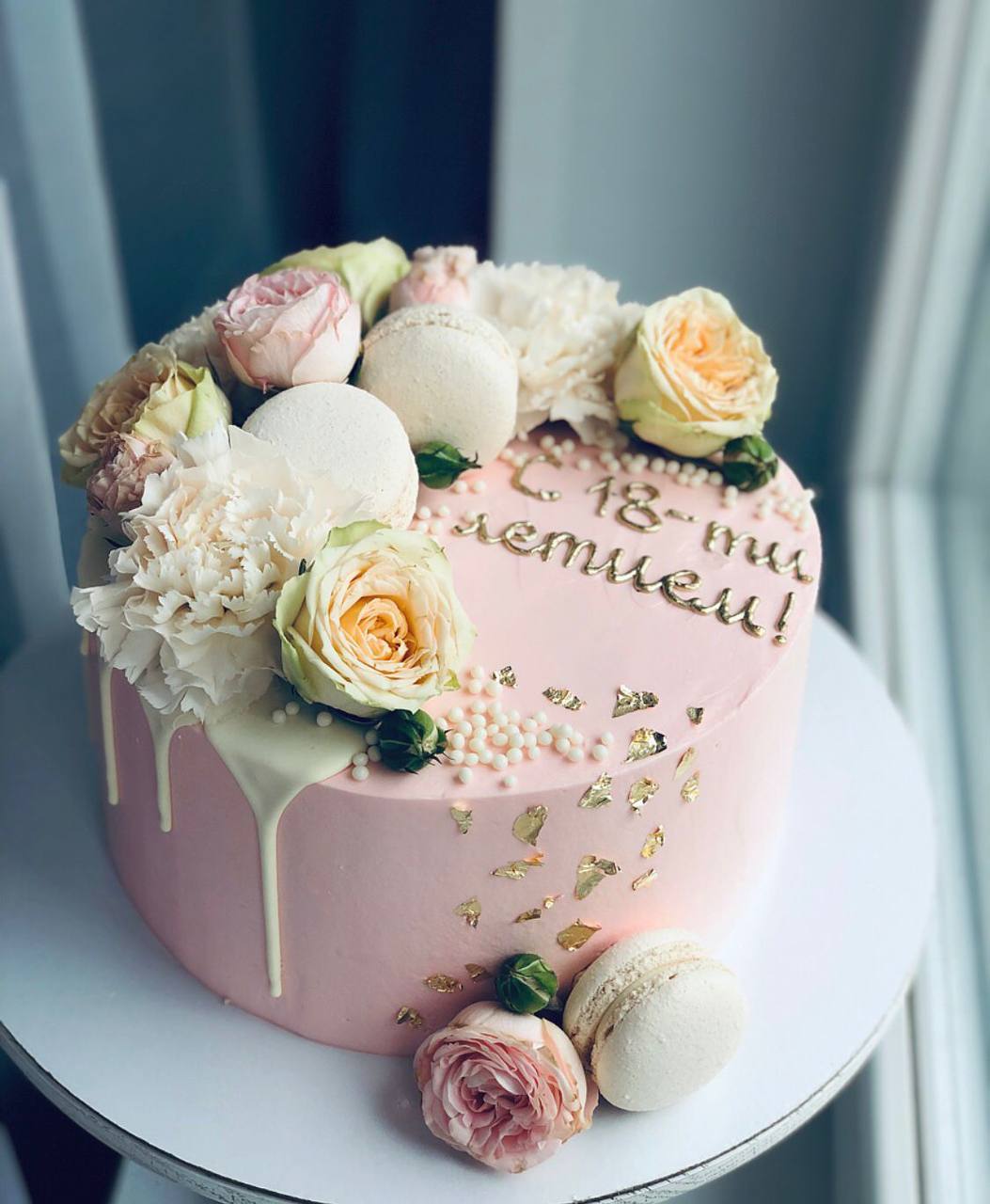 Торт украшен великолепными цветами.